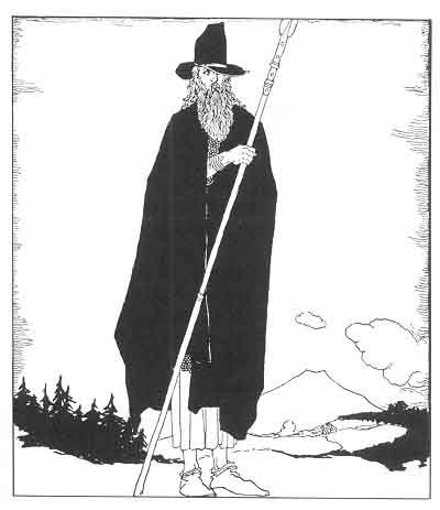 No longer was he called Odin All-Father, but Vegtam the Wanderer. He wore a cloak of dark blue and he carried a traveler's staff in his hands. And now, as he went toward Mimir's Well, which was near to Jötunheim, he came upon a Giant riding on a great Stag.
