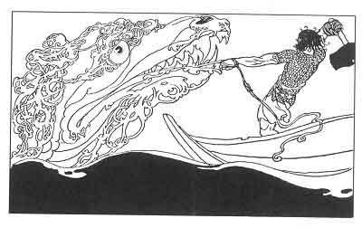 He threw out a line that had at the end of it the mighty horned head of the great bull. Down, down the head went. It passed where the whales swim, and the whales were afraid to gulp at the mighty horns. Down, down it went till it came near where the monster serpent that coils itself round the world abides. It reared its head up from its serpent coils as Thor's bait came down through the depths of the ocean. It gulped at the head and drew it into its gullet. There the great hook stuck. Terribly surprised was I the serpent monster. It lashed the ocean into a fury. But still the hook stayed. Then it strove to draw down to the depths of the ocean the boat of those who had hooked it. Thor put his legs across the boat and stretched them till they touched the bottom bed of the ocean. On the bottom bed of the ocean Thor stood and he pulled and he pulled on his line. The serpent monster lashed the ocean into fiercer and fiercer storms and all the world's ships were hurled against each other and wrecked and tossed. But it had to loosen coil after coil of the coils it makes around the world. Thor pulled and pulled. Then the terrible head of the serpent monster appeared above the waters. It reared over the boat that Hrymer sat in and that Thor straddled across. Thor dropped the line and took up Miölnir, his mighty hammer. He raised it to strike the