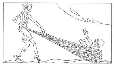 Ran, the wife of old Ægir, the Giant King of the Sea, had a net that was woven by magic. In it she took all that was wrecked on the sea. Loki thought of Ran's net and he turned and went back to Ægir's hall to ask for the Queen. But Ran was seldom in her husband's dwelling. She was now down by the rocks of the sea.