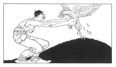 Gerriöd and Greip and Gialp rushed out and kept hold of the falcon. As the Giant held him in his hands and looked him over he knew that this was no bird-creature. The eyes showed him to be of Alfheim or Asgard. The Giant took him and shut him in a box till he would speak.