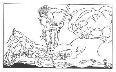 Drawing himself up out of the second pit he saw the huge shape of Fafnir heaving and lashing. He came to him and thrust his sword right through the Dragon's neck. The Dragon reared up as though to fling himself down on Sigurd with all his crushing bulk and dread talons, with his fiery breath and his envenomed blood. But Sigurd leaped aside and ran far off. Then did Fafnir scream his death scream. After he had torn up rocks with his talons he lay prone on the ground, his head in the pit that was filled with his envenomed blood.