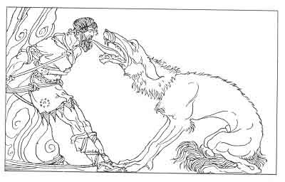 tongue to lick over his face. Then, with his strong teeth Sigmund seized the tongue of the wolf. She fought and she struggled with all her might, but Sigmund did not let go of her tongue. The struggle with the beast broke the beam to which he was chained. Then Sigmund seized the wolf with his hands and tore her jaws apart.